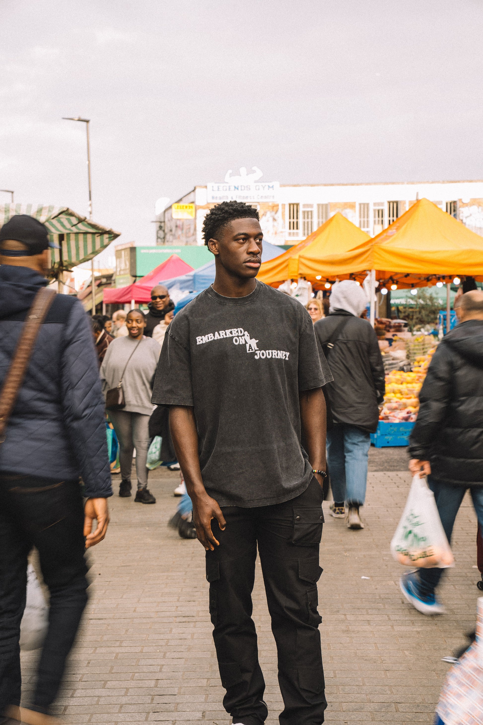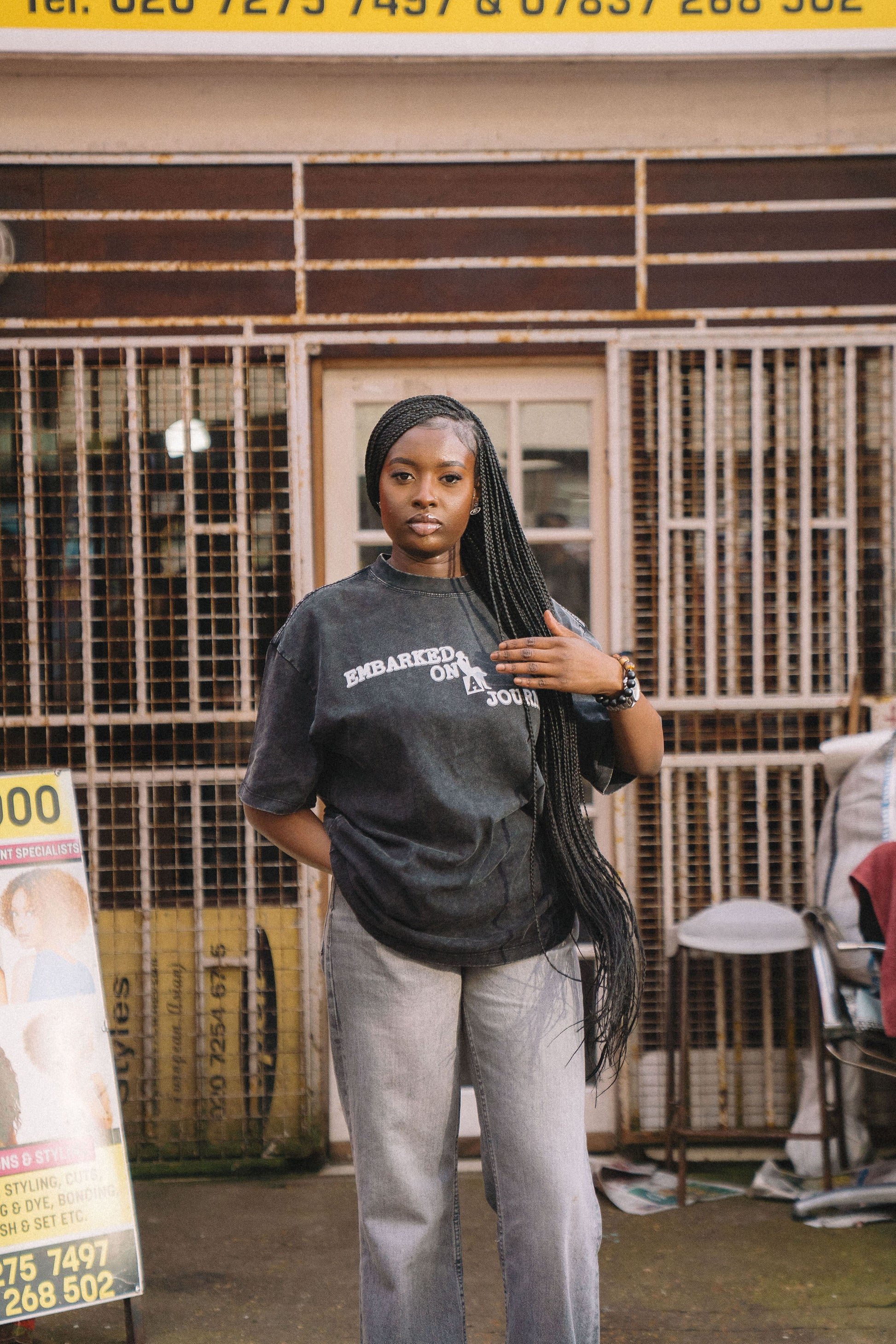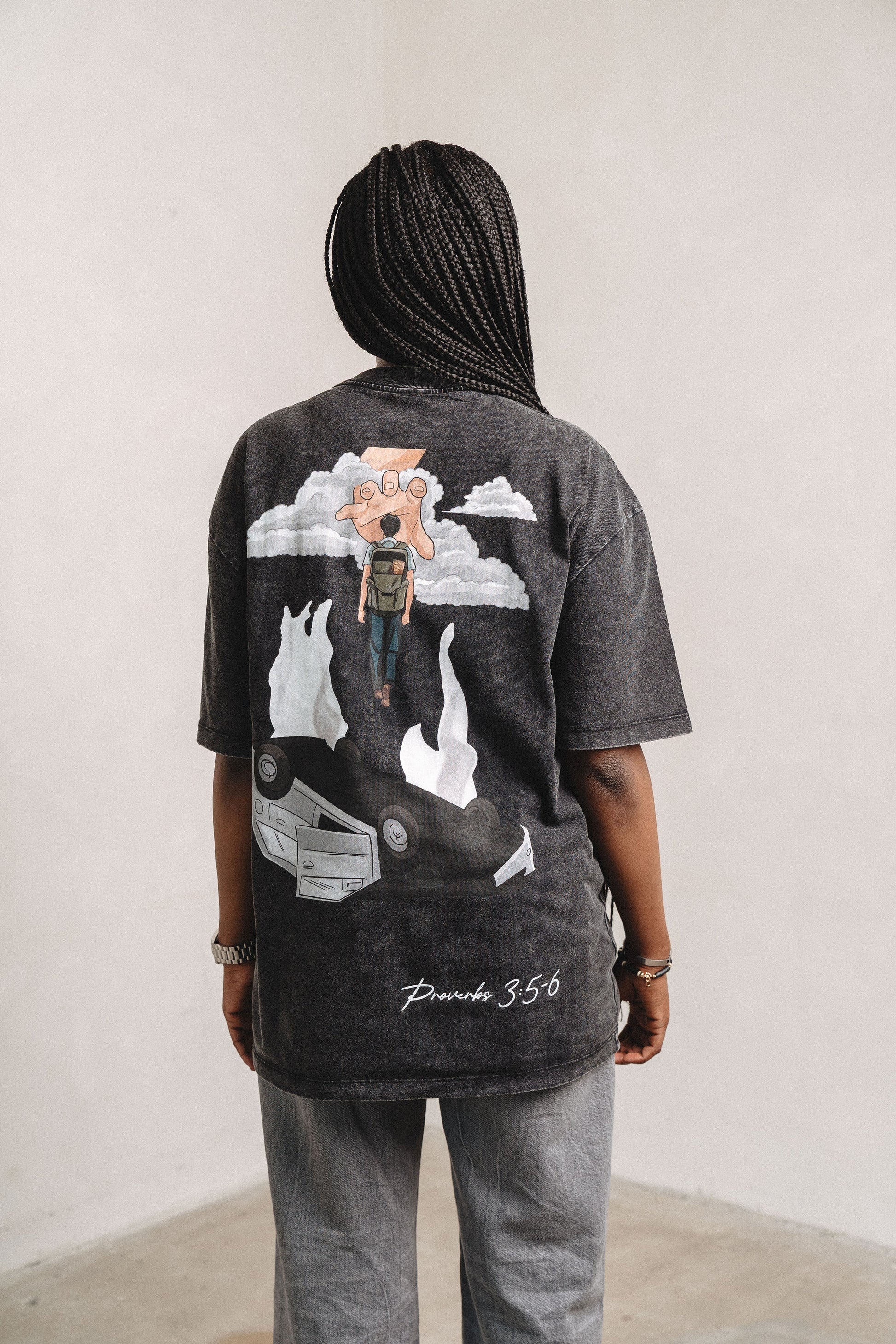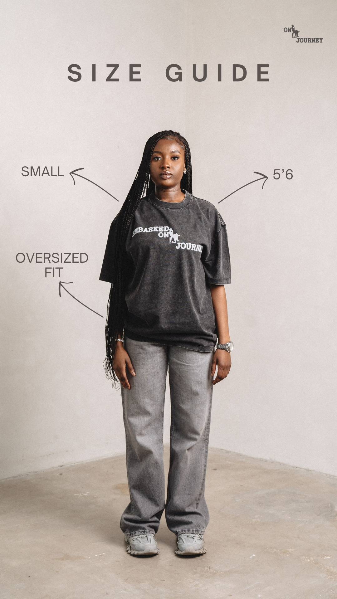 Oversized T-shirt made from compact, Heavyweight cotton (270gsm) Features a washed vintage Black tone, round neck, and short sleeves.